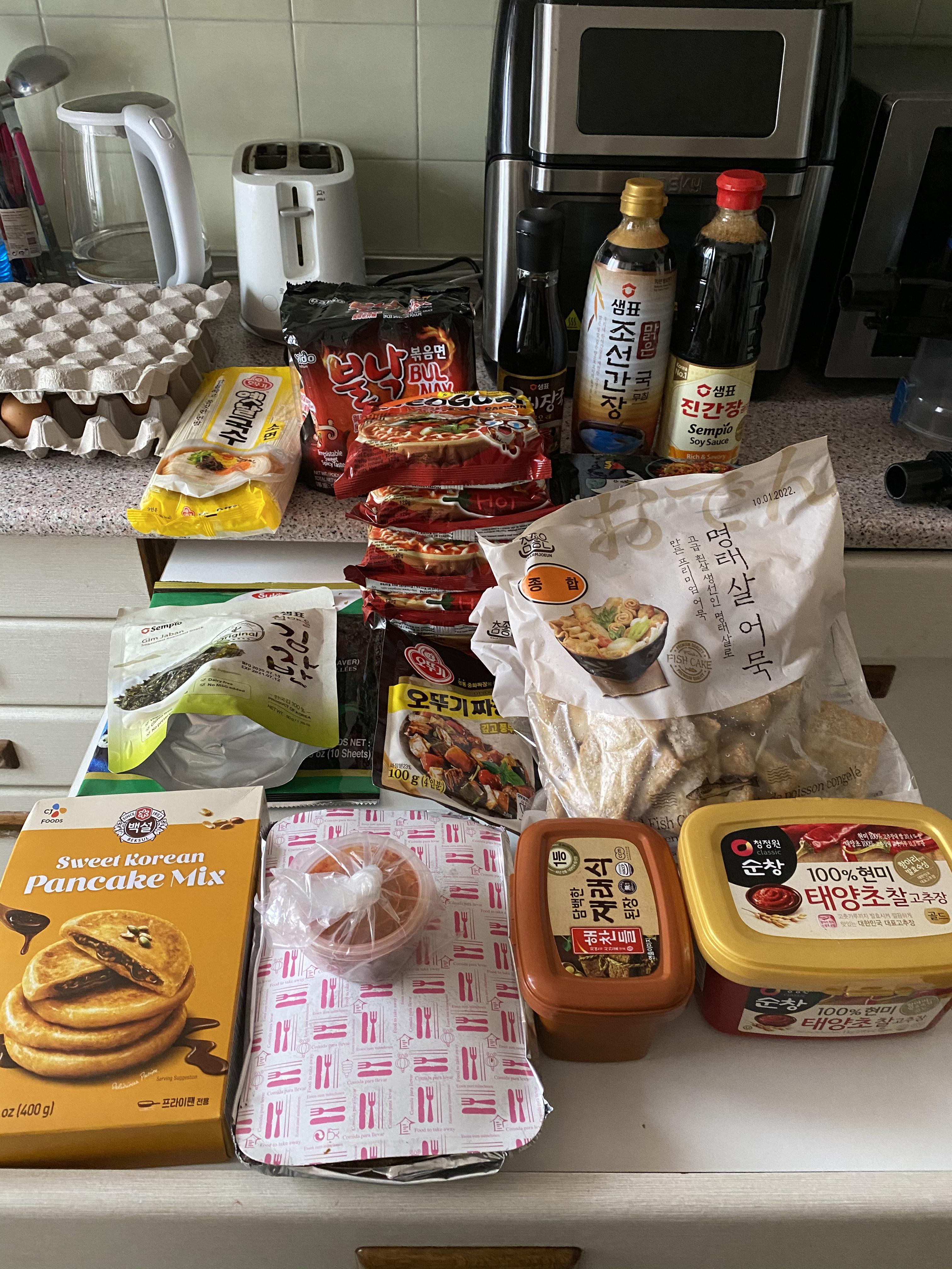 집에 와서 보니 이 정도 샀다. 정말 엄청 샀다. 가격이 평소보다 너무 많이 나와서 약간 뜨헉 했는데 생각해 보니까 한국에서 장 조금만 보면 5만원이고 10만원인 거 생각하니까 그렇게 막 막 비싼 것 같지도 않았다. 간장도 뭐 한달 쓰는 거 아니니까. (자기 위로다) 어묵도 1킬로 짜리 2개나 샀고, 소면도 1킬로나 샀는데 지금까지 없이 살았는데 저걸 한달 안에 다 먹을 것 같지 않았다. 단 좀 아껴먹으면 ...