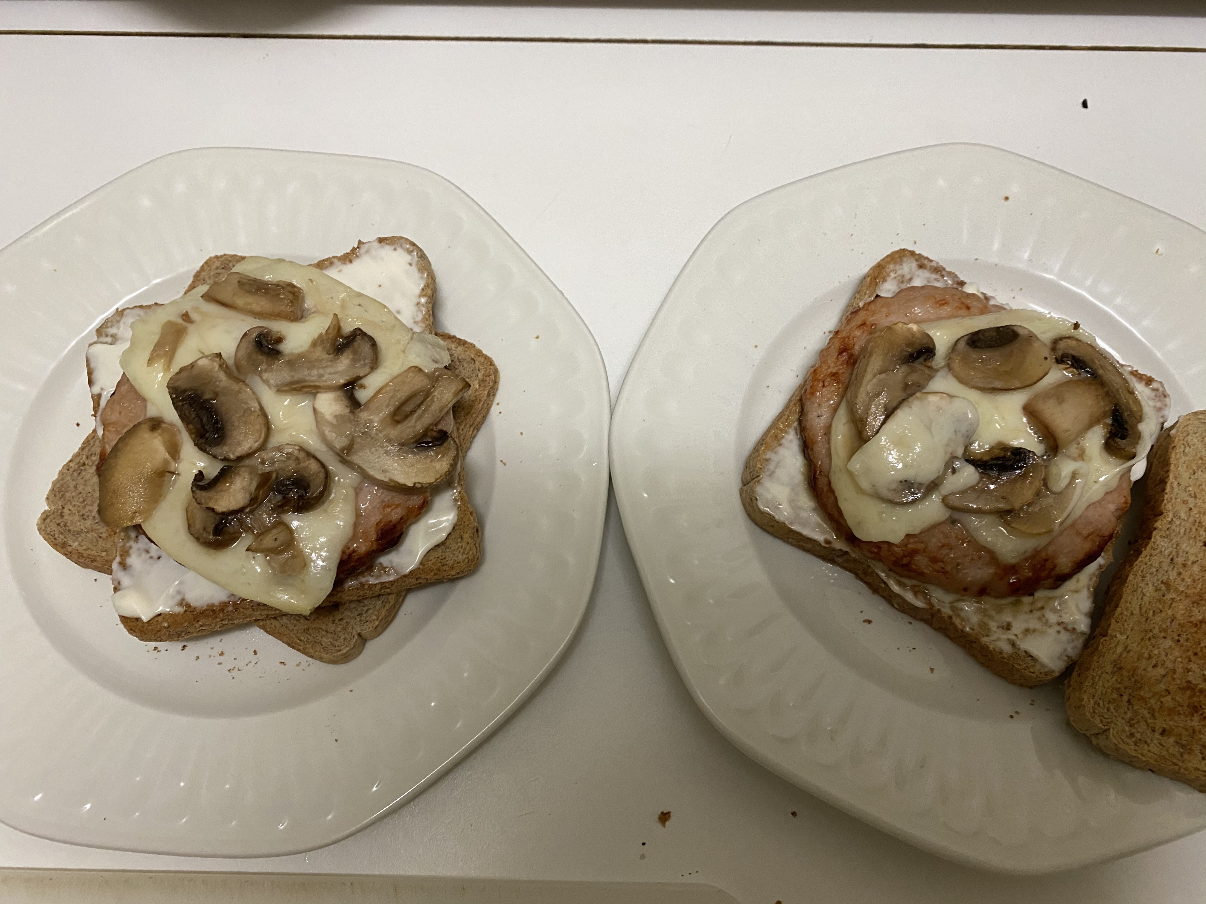 닭 패티와 치즈 버섯을 에어프라이어에 구워서 마요네즈를 바른 빵 위에 올렸다. 고기의 사진도 찍으려고 했지만 손이 없어서 이렇게 만족 허허