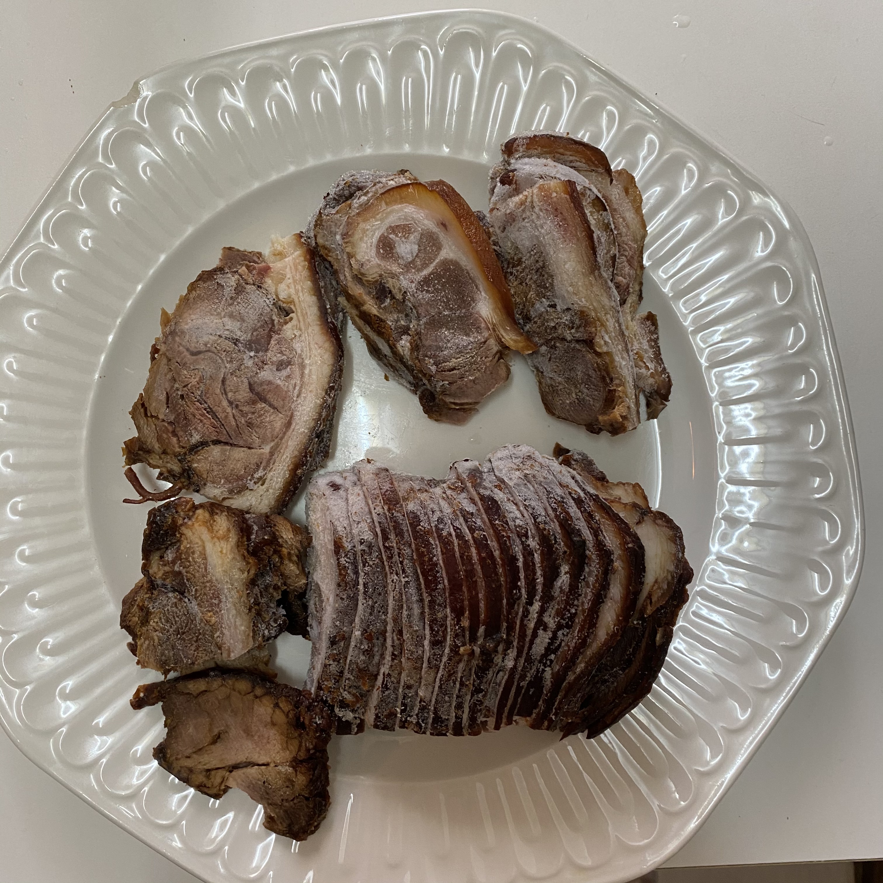 그래서 점심으로는 방금 사온 어묵과 가쓰오부시장으로 어묵탕을 만들고, 사온 족발도 데웠다. 아래에 있는 사진에 사온 거 반이다. 약 4인분 정도를 판다고 하셨다. (참고로 가격은 25유로) 요리가 되서 얼려있는 거 먹고 싶은 만큼 전자레인지에 돌리면 된다. 그리고 젓갈 소스도 넣어주셨다.