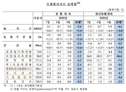 10월 수출물가 2.6%↓…약 2년 만에 최대 하락, 성서호기자, 경제뉴스 (송고시간 2020-11-12 06:00)