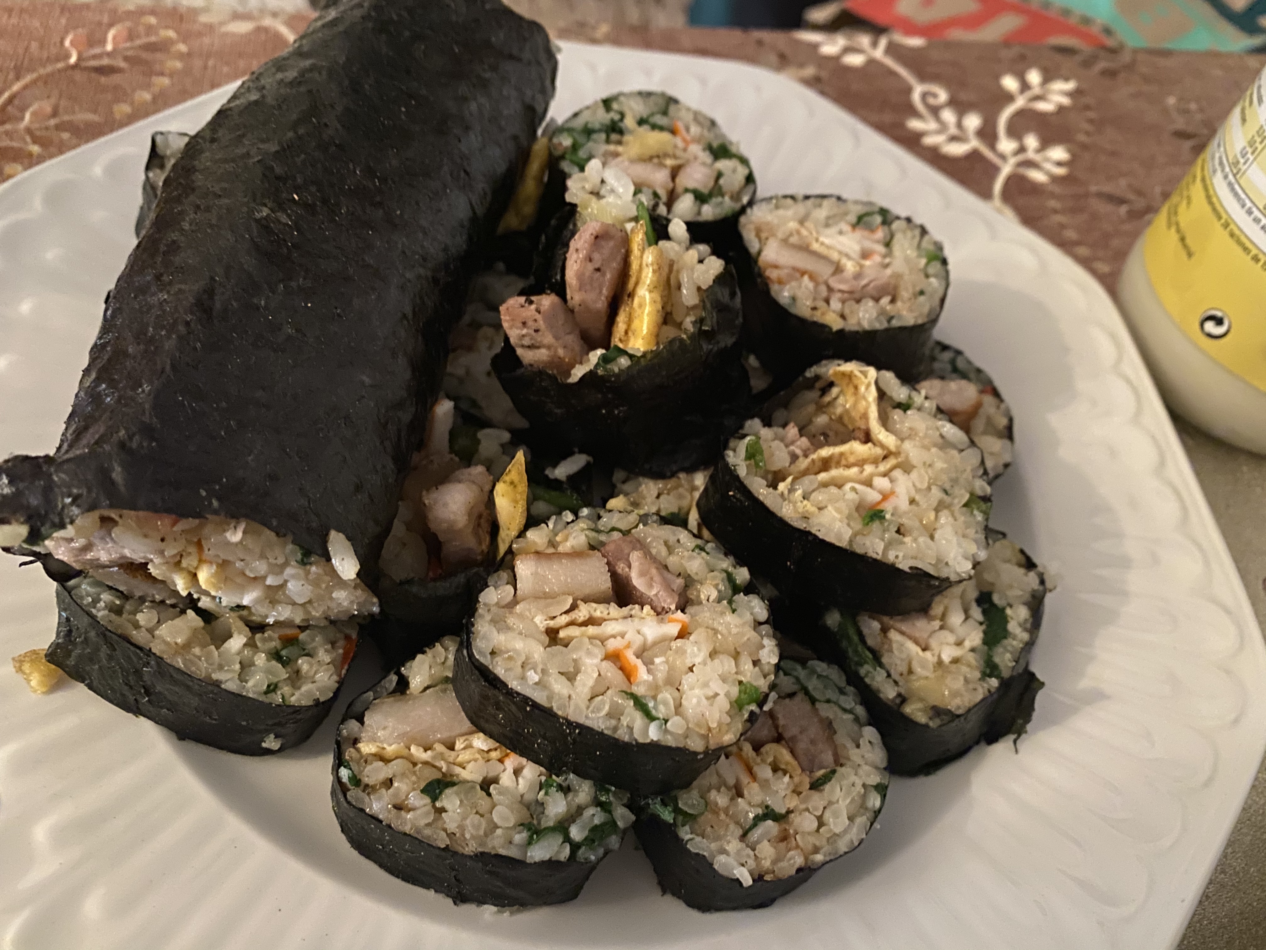 남자친구는 옆에서 김밥을 말고 나는 볶음우동을 만들어서 이렇게 나왔다. 이게 면이 아무리 생각해도 너무 두껍다 ㅋㅋㅋㅋㅋ 전에 남은 닭패티도 잘라서 볶음 우동에 넣어줬다. 여기는 면 엄청 두껍고, 김밥은 말리는데 닫히지도 않고 완전 난리였다 ㅋㅋ 그래서 밑에 김밥을 보면 하나 통으로 들어가 있는데 이게 자꾸 풀려서 그렇다 ㅋㅋㅋ 참기름을 잘 발라줬어야 했는데 ㅋㅋㅋㅋㅋ