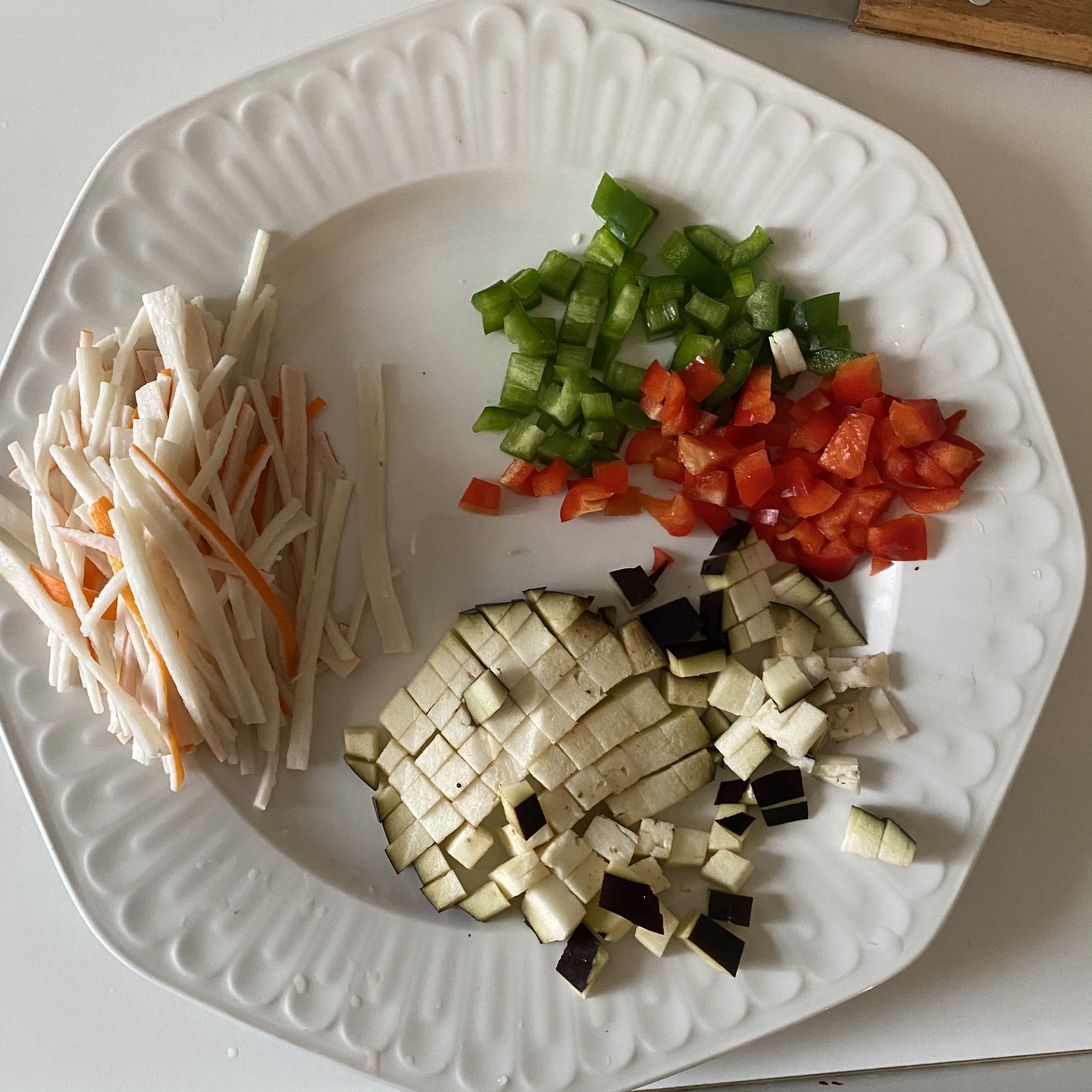 그리고 계란 지단, 맛살을 준비하고나서, 이것저것 재료 넣기가 구찮으니, 가지랑, 파프리카들을 잘라놨다. 아예 볶음밥 스타일로 하려고. 당근이 없어서 조금 아쉬웠다.