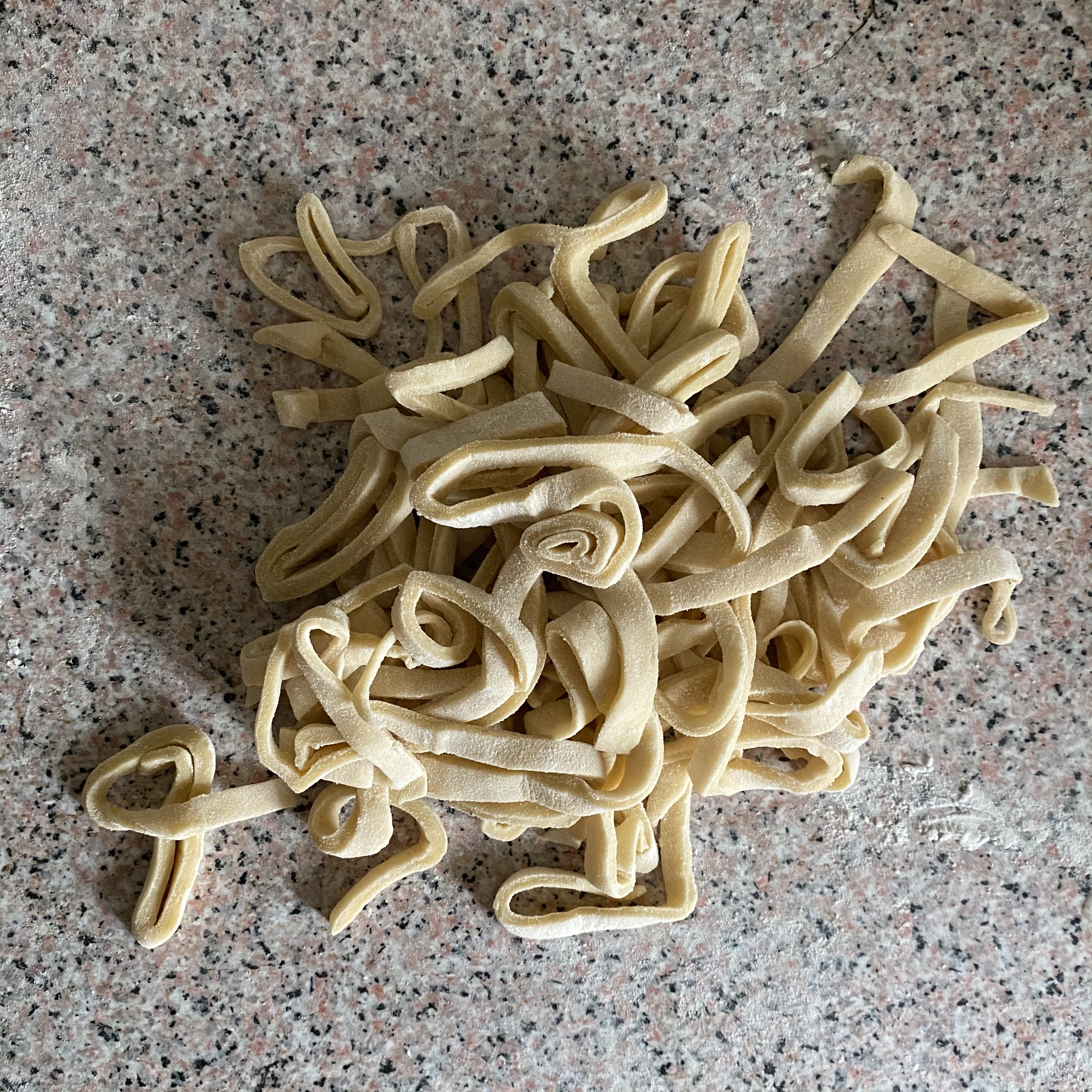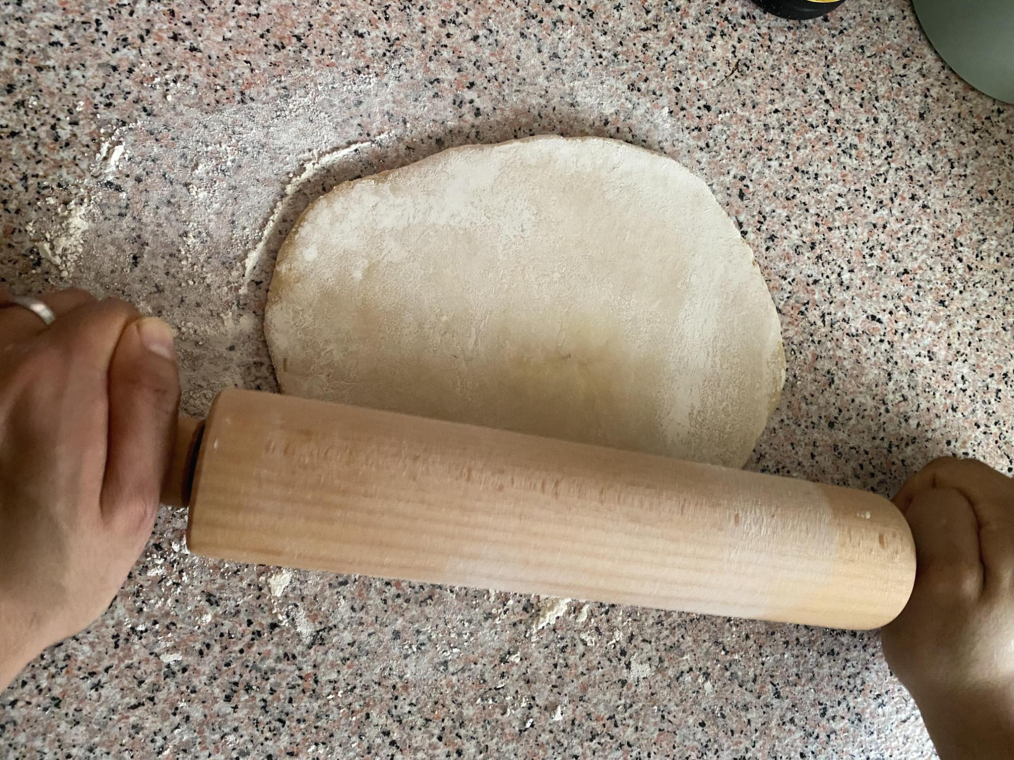 이제 반죽을 꺼내서 밀대로 미는데 와 이거 너무 뻑뻑하다.... 앞으로는 물을 더 넣어야 할 듯. 너무 뻑뻑해도 사실 밀어서 얇게 만들 수는 있었지만, 배도 고프고 해서 대충 밀었더니 꽤 두껍게 나왔다.