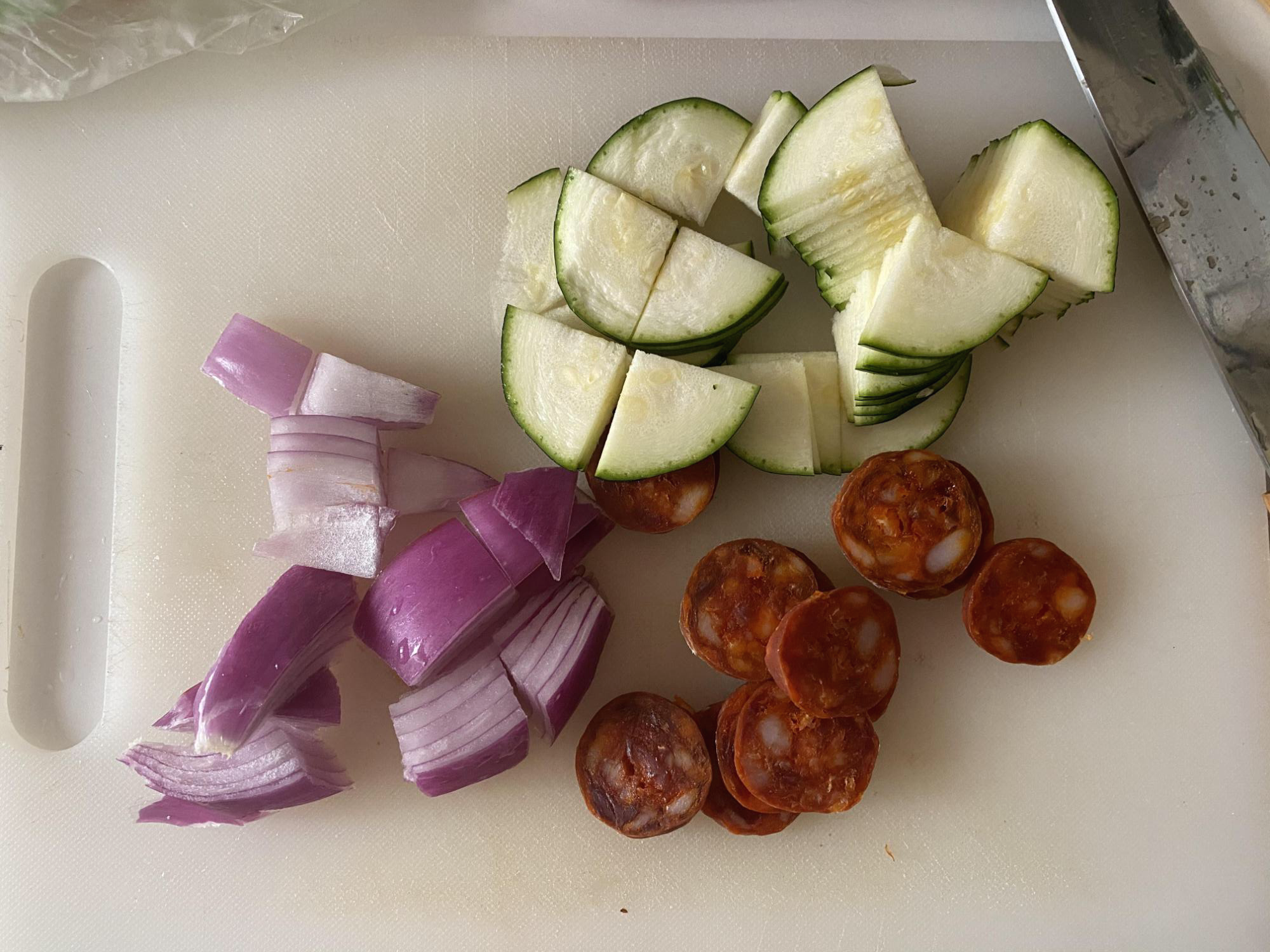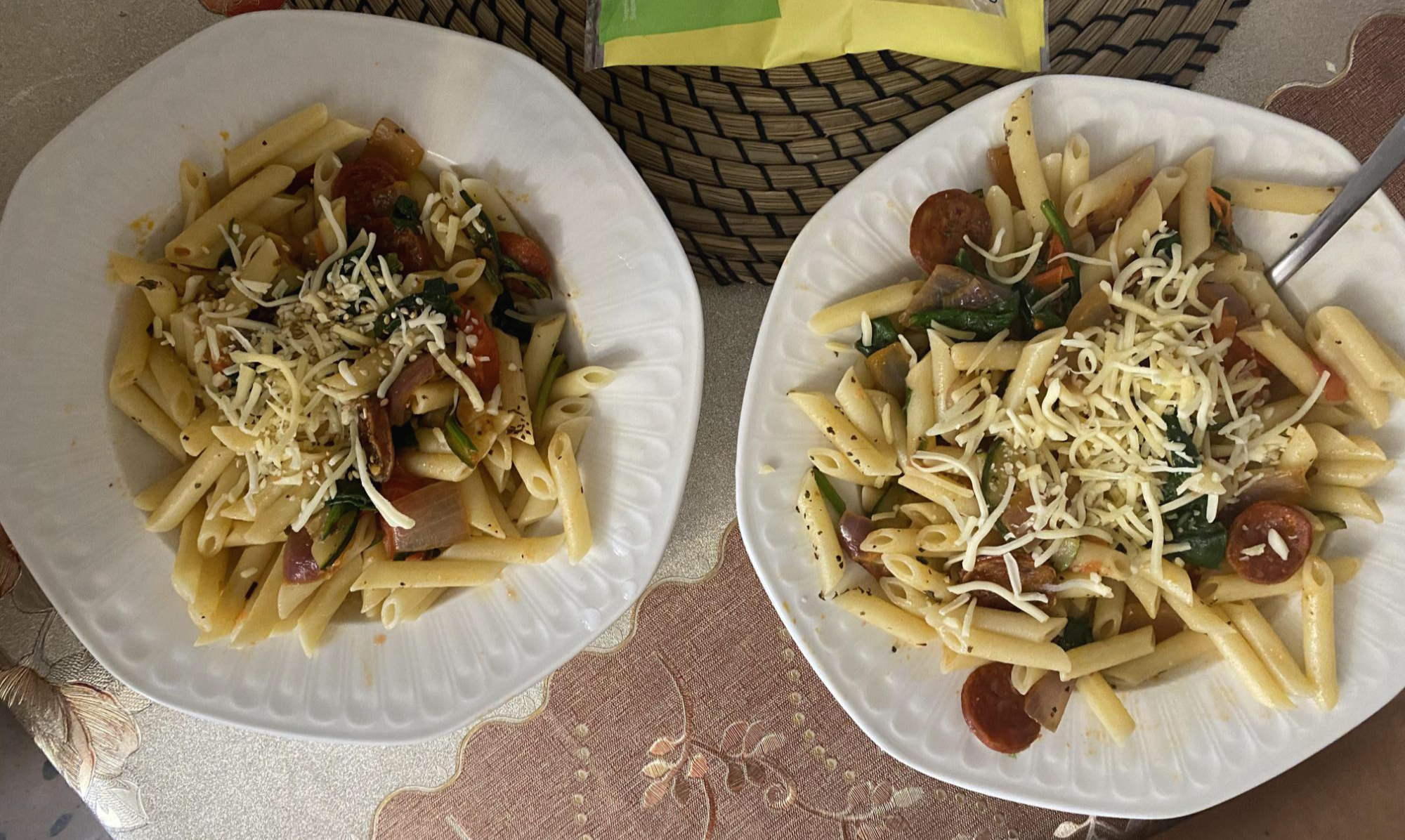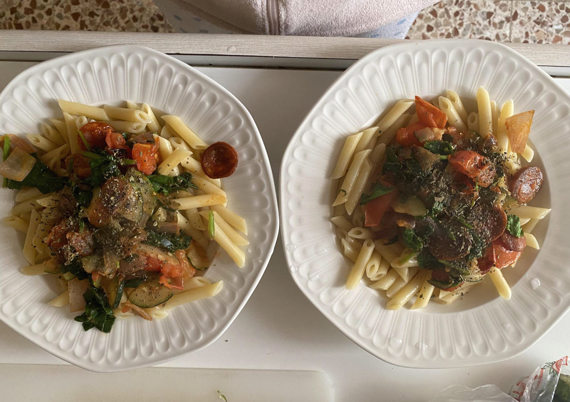 점심은 간단한 파스타를 만들었다. 초리조를 넣어서 초리조 파스타라고 했지만, 사실은 이거 콜드 파스타다. 콜드 파스타 그냥 안 식히고 먹으니 걍 초리소 파스타. 엄청 쉽다. 야채도 별로 안 넣고 만들어서. 양파, 초리조, 호박, 시금치, 토마토 이렇게 넣었다. 그냥 집에 있는 야채 한 두개 정도만 넣고 만들면 되는 것 같다.