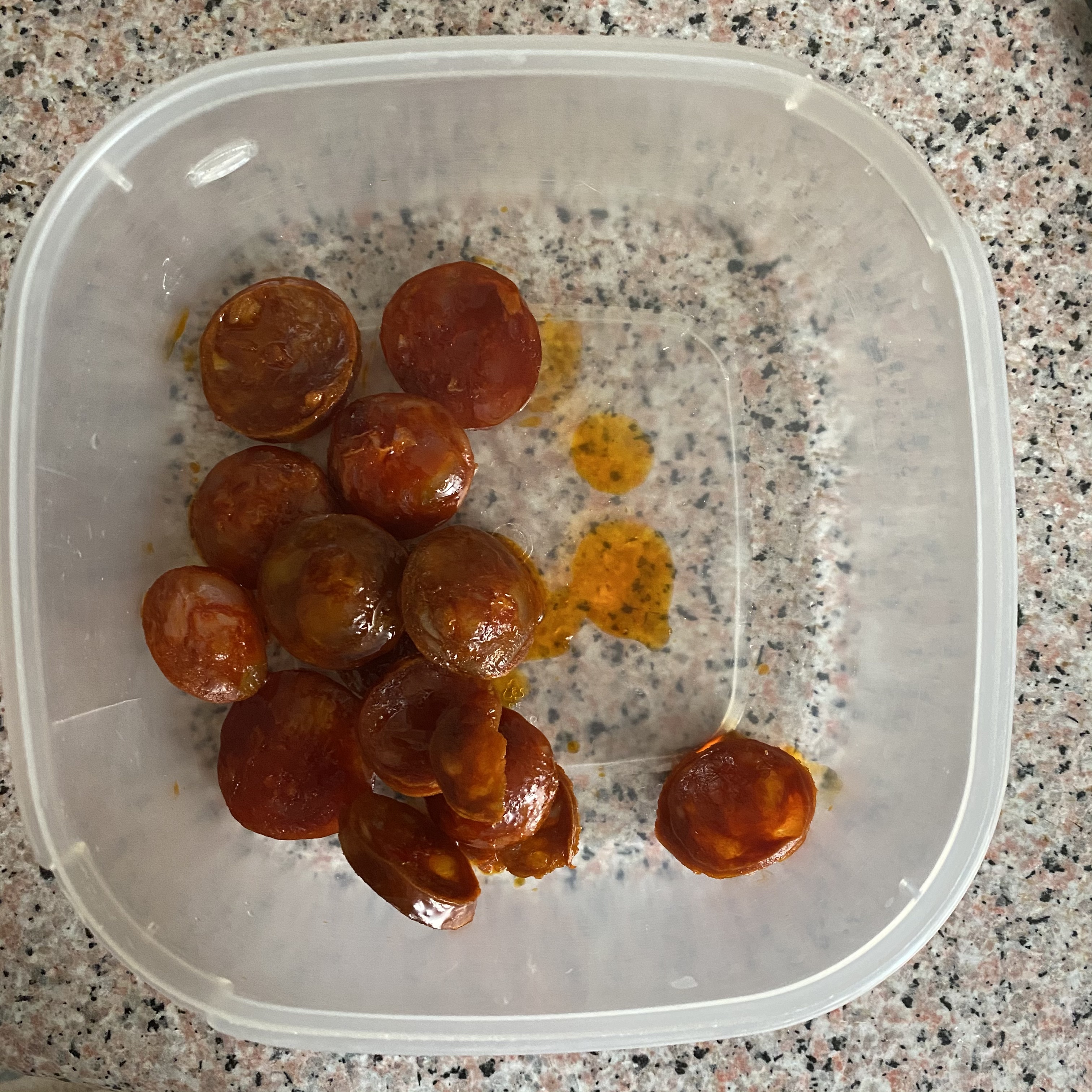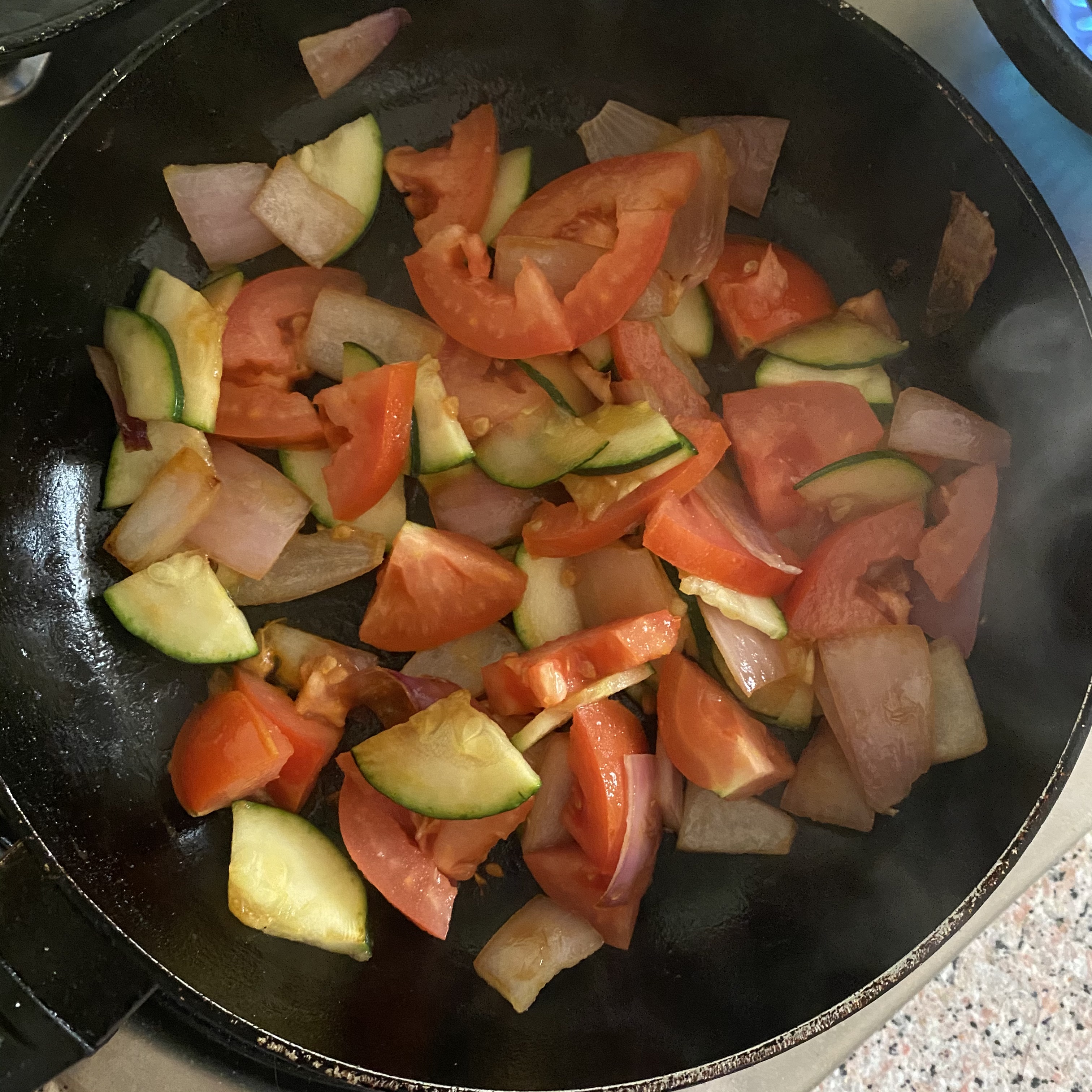 일단 초리조를 잘라서 먼저 구워졌다. 나는 집에 있어서 넣었는데 초리조가 없으면 베이컨을 넣어도 될 것 같다. 초리조는 굽고나서 후라이팬에서 빼 준다. 그리고 같은 후라이팬에 남은 야채들은 그냥 막 볶아준다. 토마토만 조금 늦게 넣고 있는 대로 볶아주면 된다.