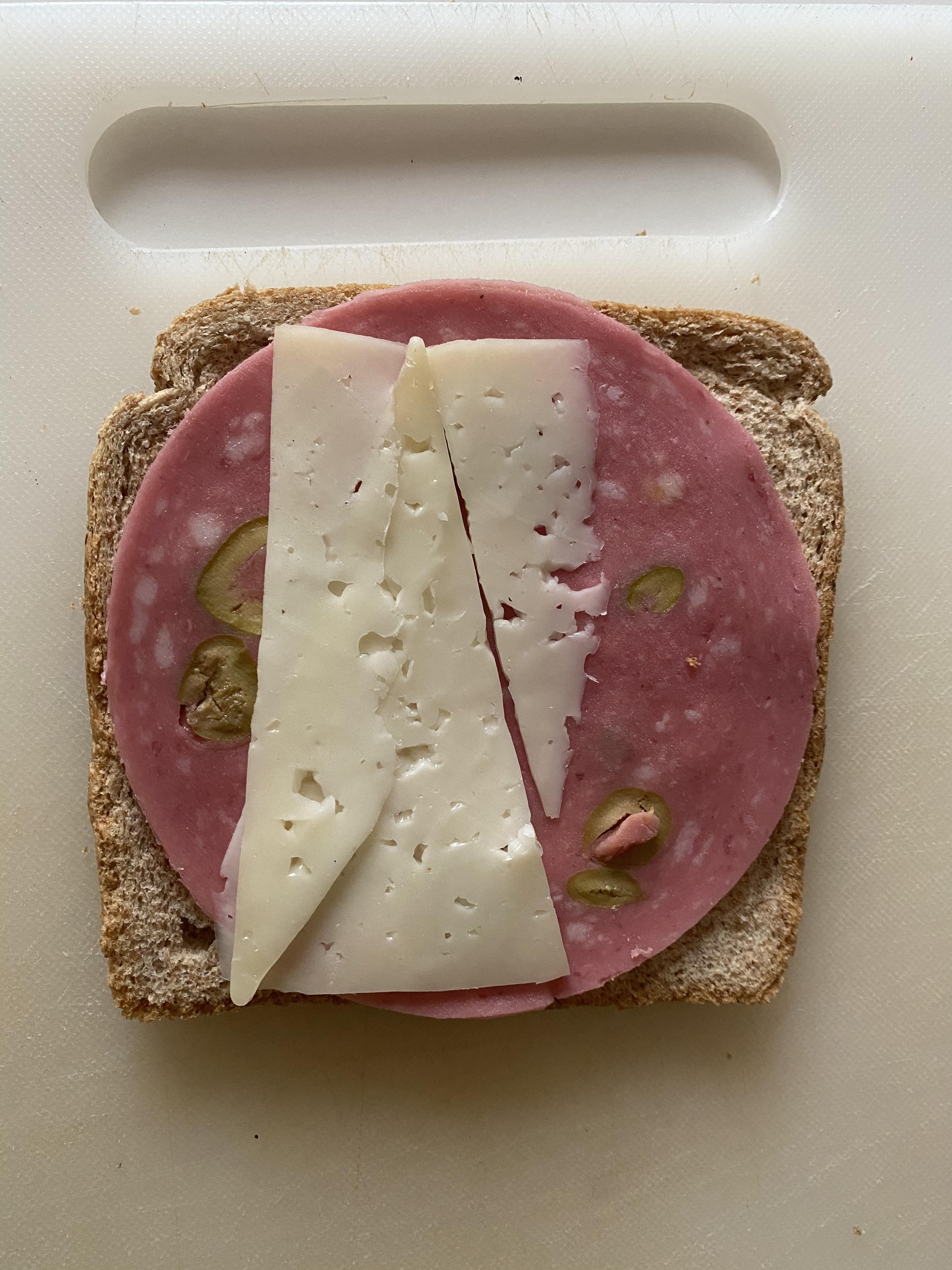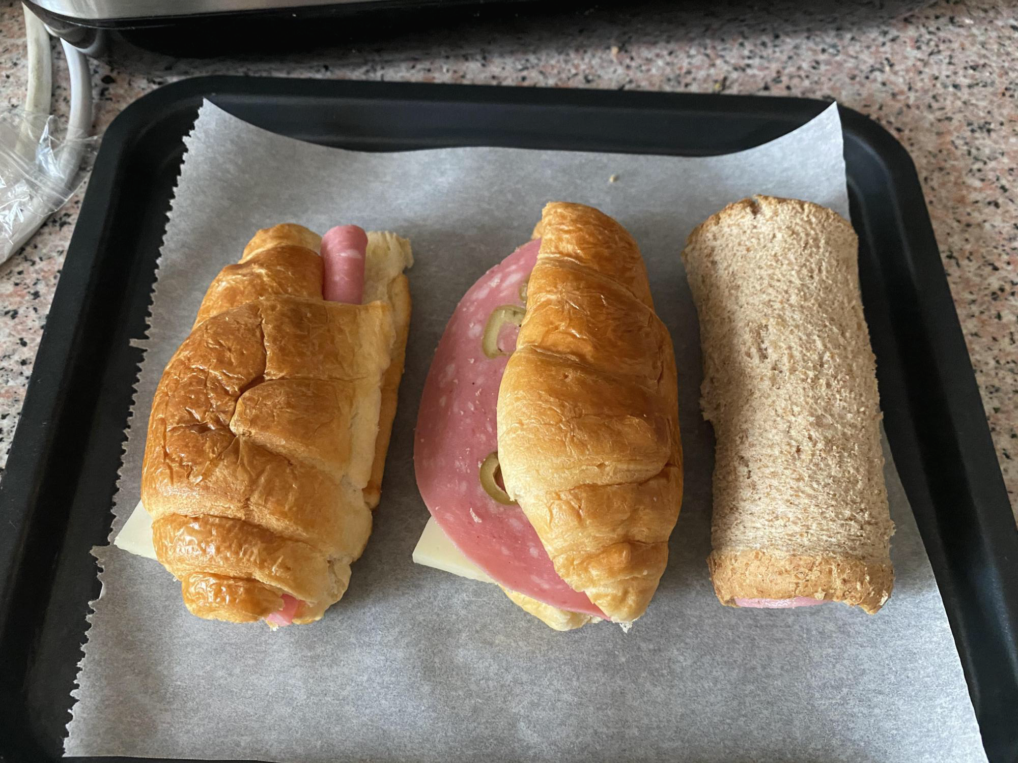 집에 남은 크로와상도 없고 식빵도 없어서 섞어서 만들었다. 있는 대로 ㅎㅎ 저 모르따델라 햄도 마지막이었다. 에어프라이어에 한 5분정도 돌려서 완성!