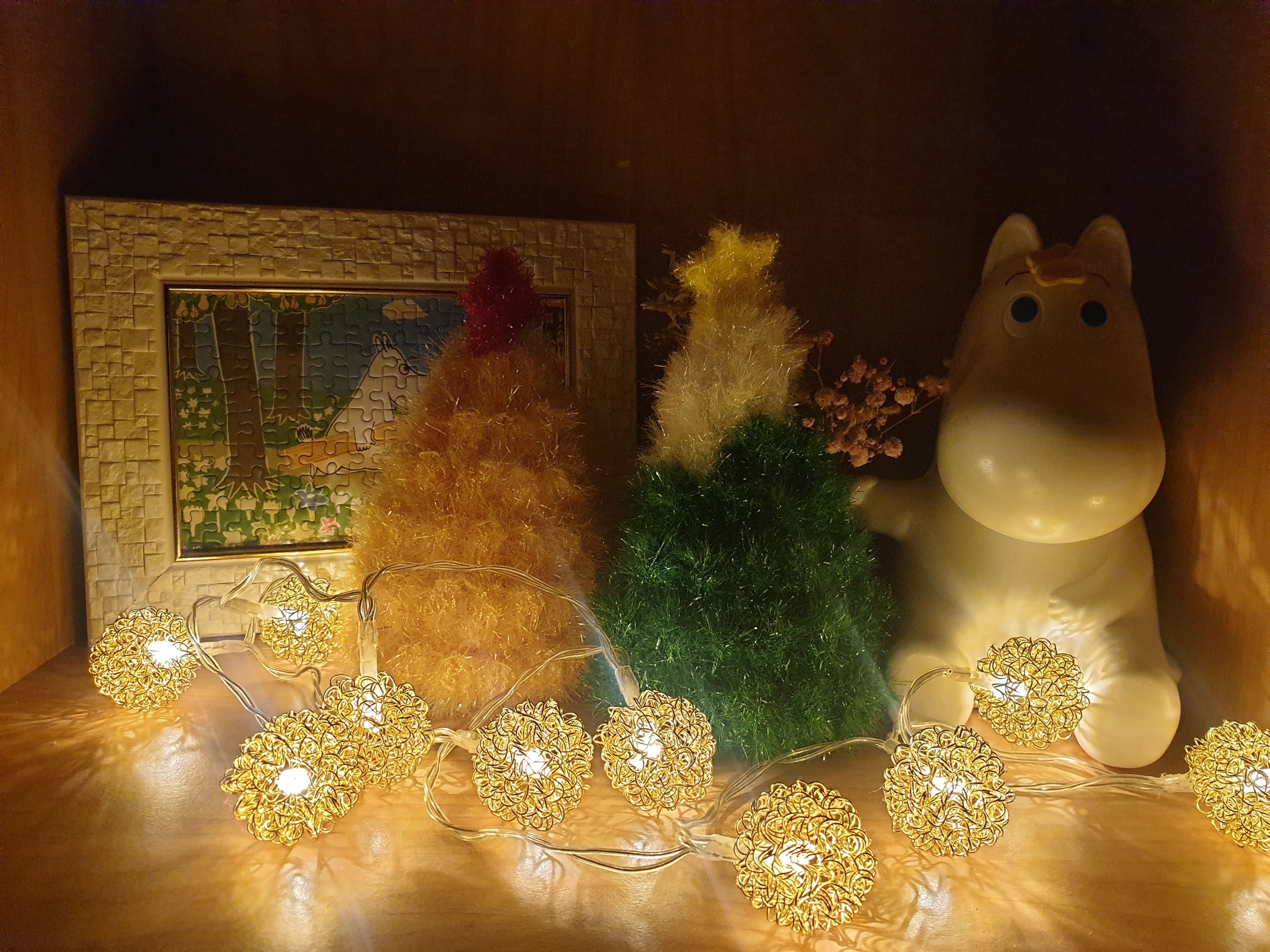 내가 장식한 곳은 무민 저금통과 무민 액자가 있는 곳이다. 올가을에 방청소를 아주 크게 했는데 미니멀 라이프를 살겠다고 무민우유를 먹으면서 모았던 무민 피규어를 다 버렸다. 무민 저금통과 무민 액자는 차마 버리지 못하고 두고 있었는데 이렇게 꾸며 놓으니 예쁘다. 침대 옆에 있는 워터볼들도 옆에 갖다놔야겠다. 올해 크리스마스는 나가지 못할거 같으니까 이렇게 예쁘게 꾸미고 놀아야겠다~