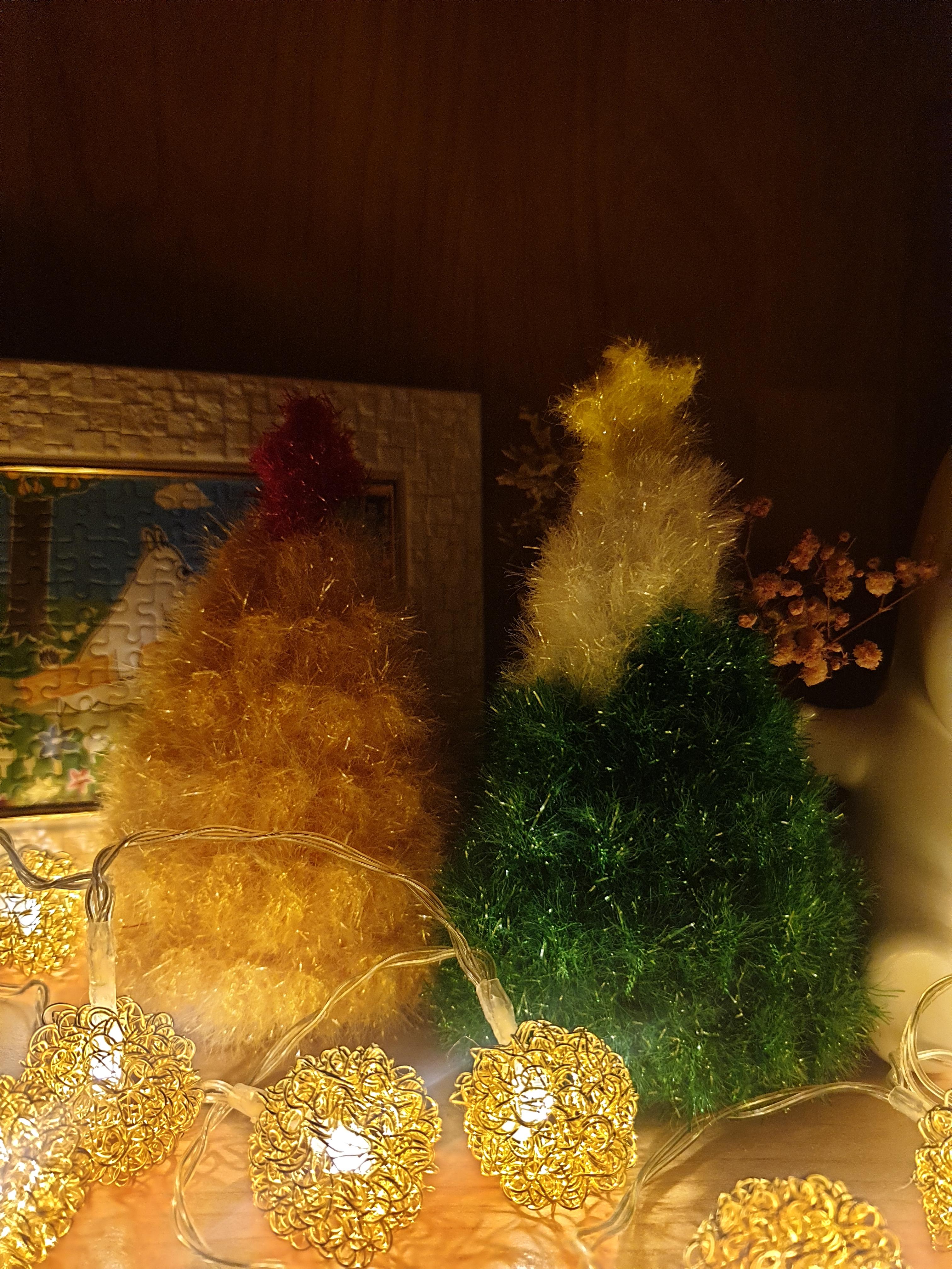 전구들 사이에 크리스마스트리 수세미를 두었다. 하하 진짜 내가 이렇게 수세미를 열심히 뜨고 있는게 아직도 신기하고 수세미실로 크리스마스 트리까지 만들다니 더 신기하다 ㅋㅋㅋㅋ 나는 시간부자ㅋㅋㅋㅋㅋㅋ
