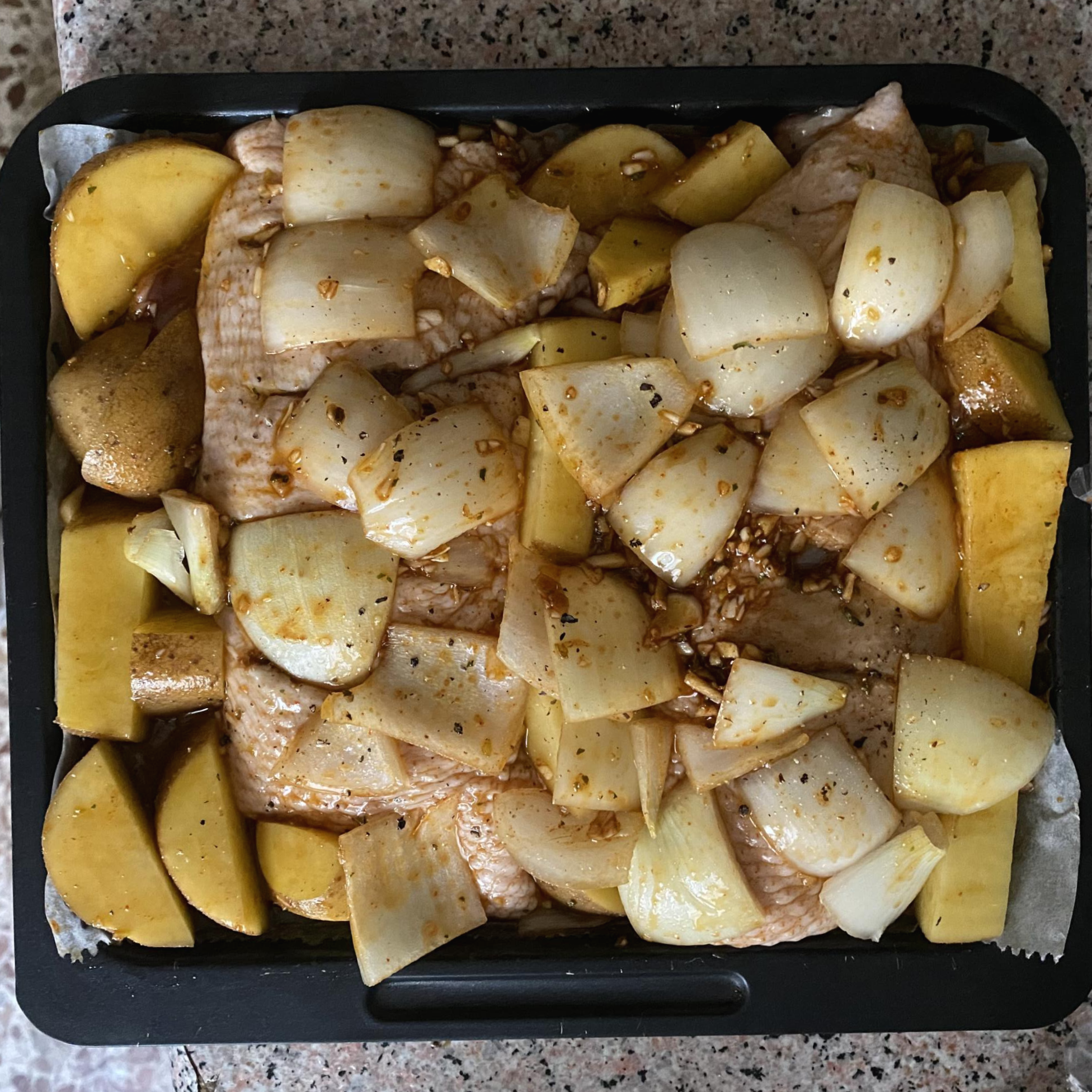 위에 양파와 감자도 얹어줬다. 그리고 에어프라이어에서 나온 모습은 이렇다.