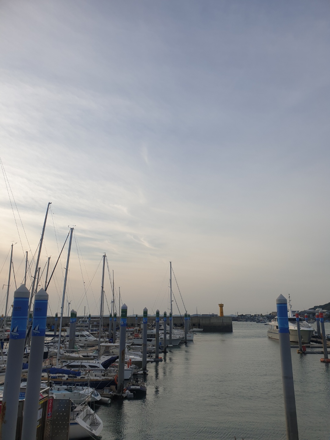시멘트 길이 안보이고 하늘이 많이 보이도록 찍어보았다. 해가 어스름하게 지고 있다. 멀리보이는 빨간 등대로 가는 길은 코로나 때문에 폐쇄중이라 갈 수가 없다. 해가 지고 있어서 개인 요트들이 하나 둘씩 물 위로 올라고 있었다. 이것도 신기한 구경이었다 :) 사진을 찍을걸 구경만 했다 ㅠㅠ